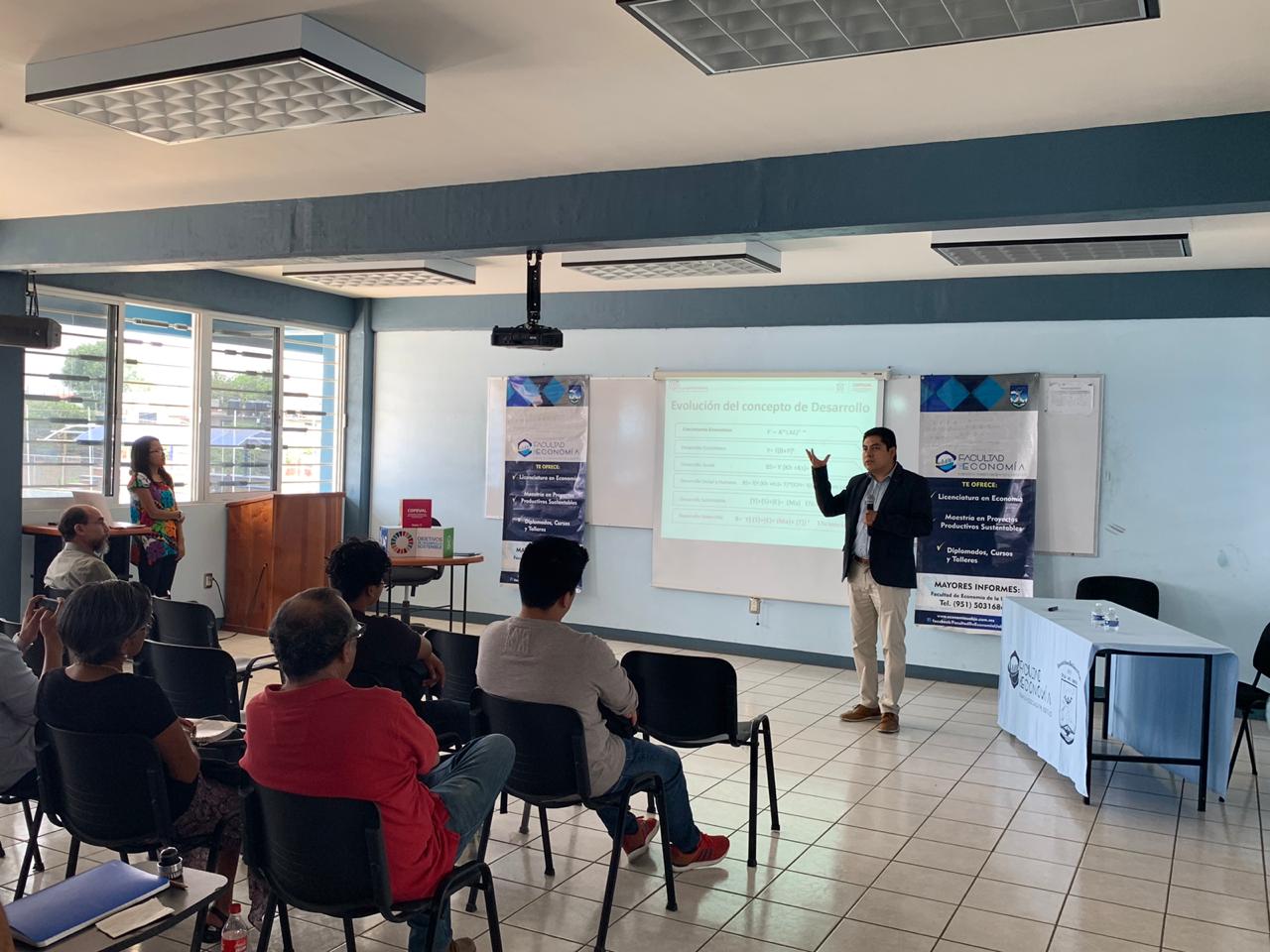 Con el objetivo de fortalecer estas acciones realizadas en conjunto con instancias académicas de la entidad y crear espacios de participación ciudadana entre estudiantes, catedráticos, investigadores y gobierno, el Mtro. Juan Pablo Morales García, Coordinador General de la COPEVAL, impartió la conferencia “Retos y Oportunidades para el Desarrollo Sostenible de Oaxaca”, donde abordó temas de Evolución del concepto de Desarrollo, Pobreza y Medición de la pobreza multidimensional así como reflexiones sobre los retos para minimizar la desigualdad y abatir la pobreza en el mundo, AL, México y Oaxaca y la importancia de comprender la riqueza intangible de las comunidades y comprender las cualidades colectivas.