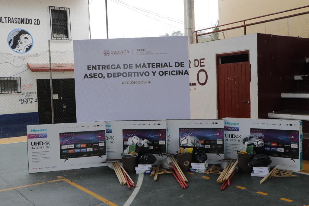 En esta semana, personal del Instituto que se trasladó a la Heroica Ciudad de Tlaxiaco, en la Mixteca Alta oaxaqueña, dio atención a 73 planteles educativos con la dotación de paquetes de material didáctico, cívico, de aseo, deportivo y de oficina, así como pizarrones y banderas.