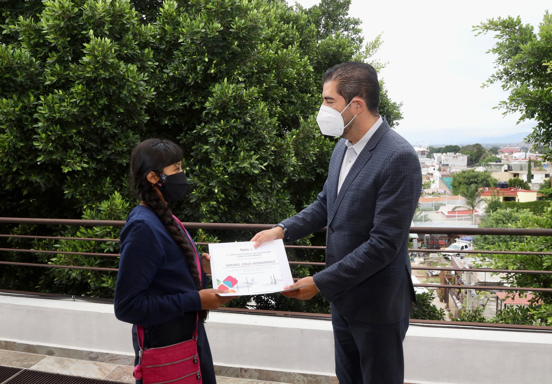 - A nombre del gobernador Alejandro Murat Hinojosa, el Encargado de Despacho del IEEPO, José Luis Rangel, felicitó a la estudiante Mariel Cruz Hernández