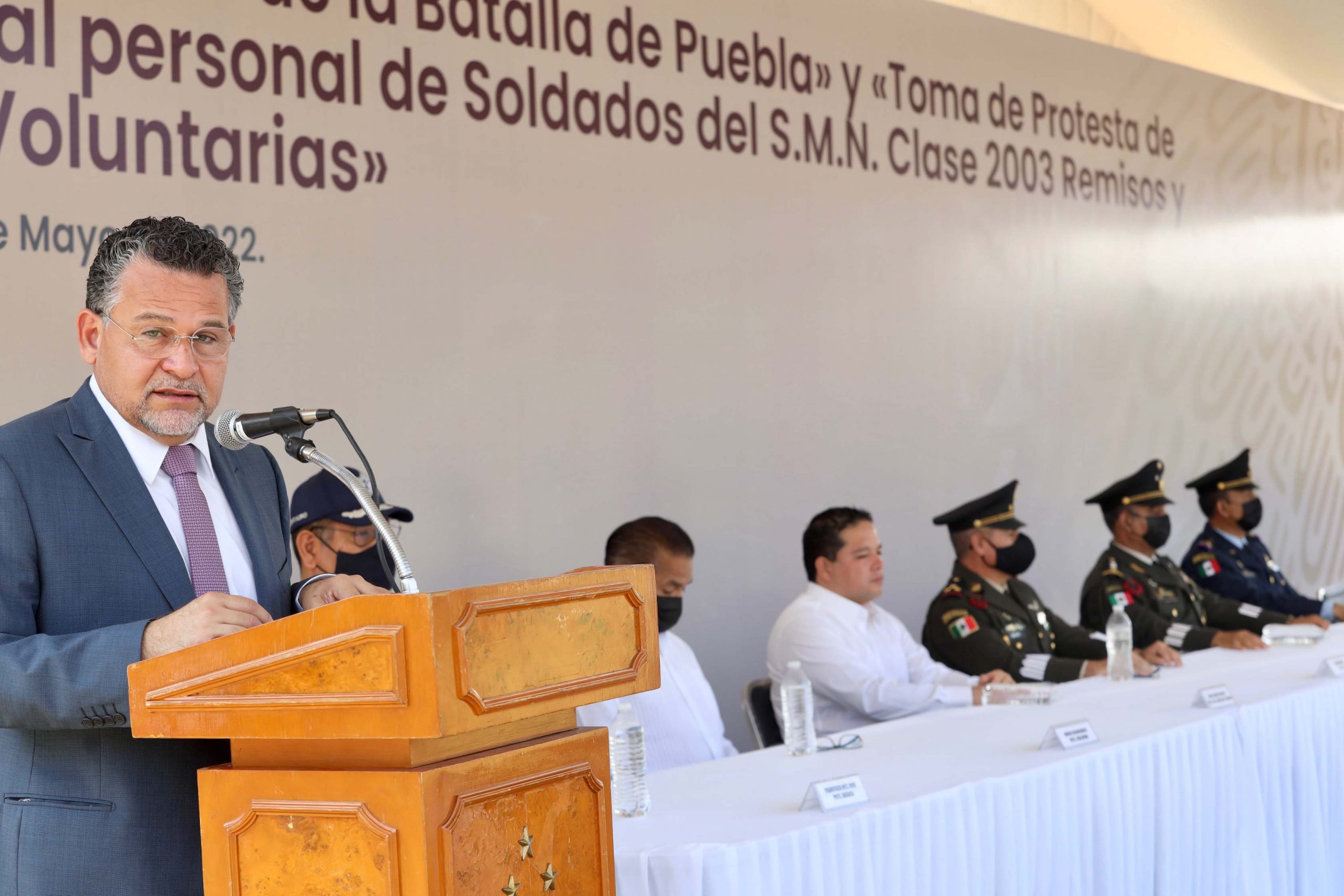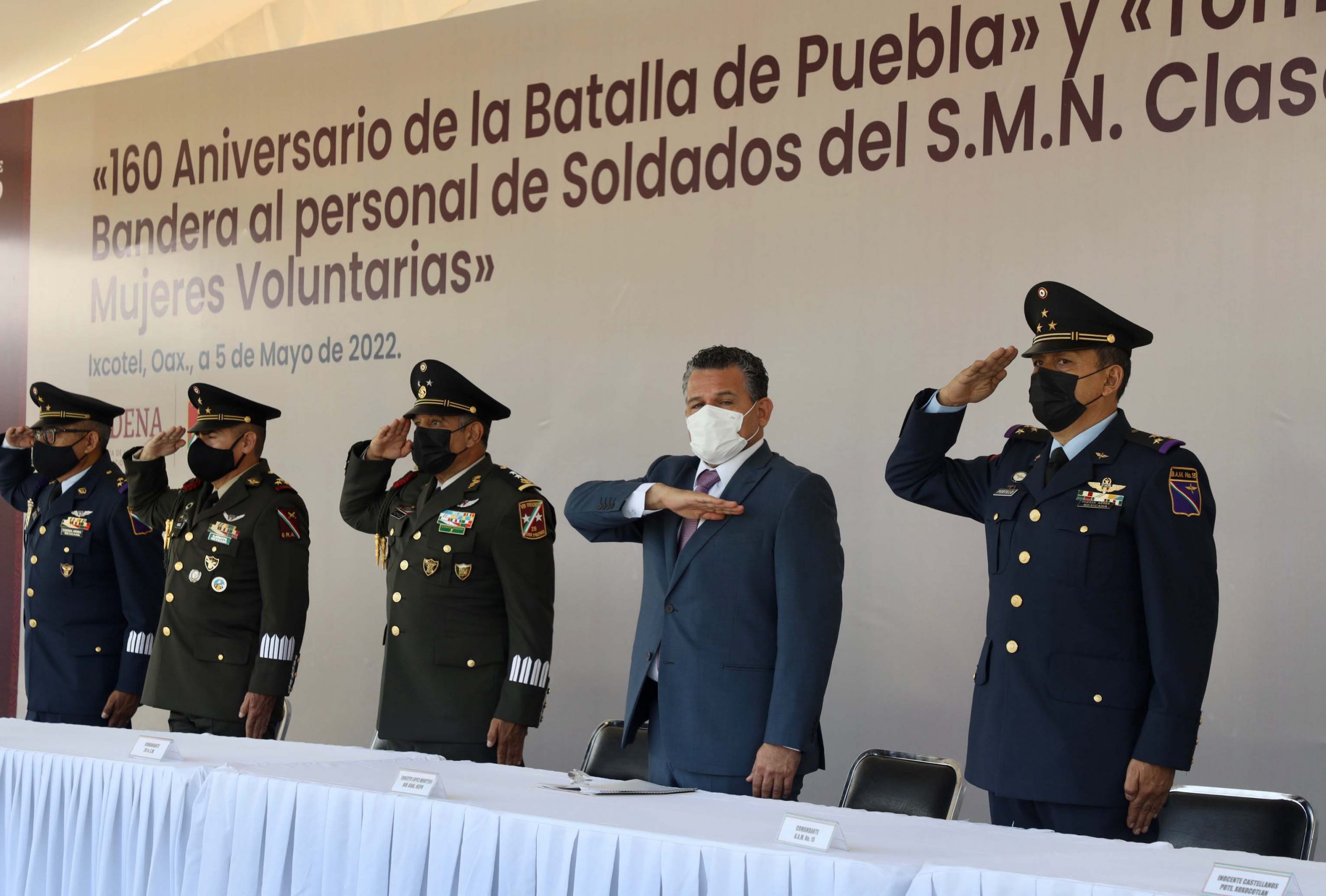 Santa Lucía del Camino, Oax. 5 de mayo de 2022.- Con la representación del Gobernador del Estado, el Encargado de Despacho del Instituto Estatal de Educación Pública de Oaxaca (IEEPO), presidió junto con el Comandante de la 28a. Zona Militar, la ceremonia conmemorativa por el CLX Aniversario de la Batalla de Puebla y Toma de Protesta de Bandera al personal de Soldados del Servicio Militar Nacional, Clase 2003, Remisos y Mujeres Voluntarias.