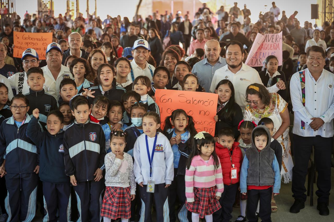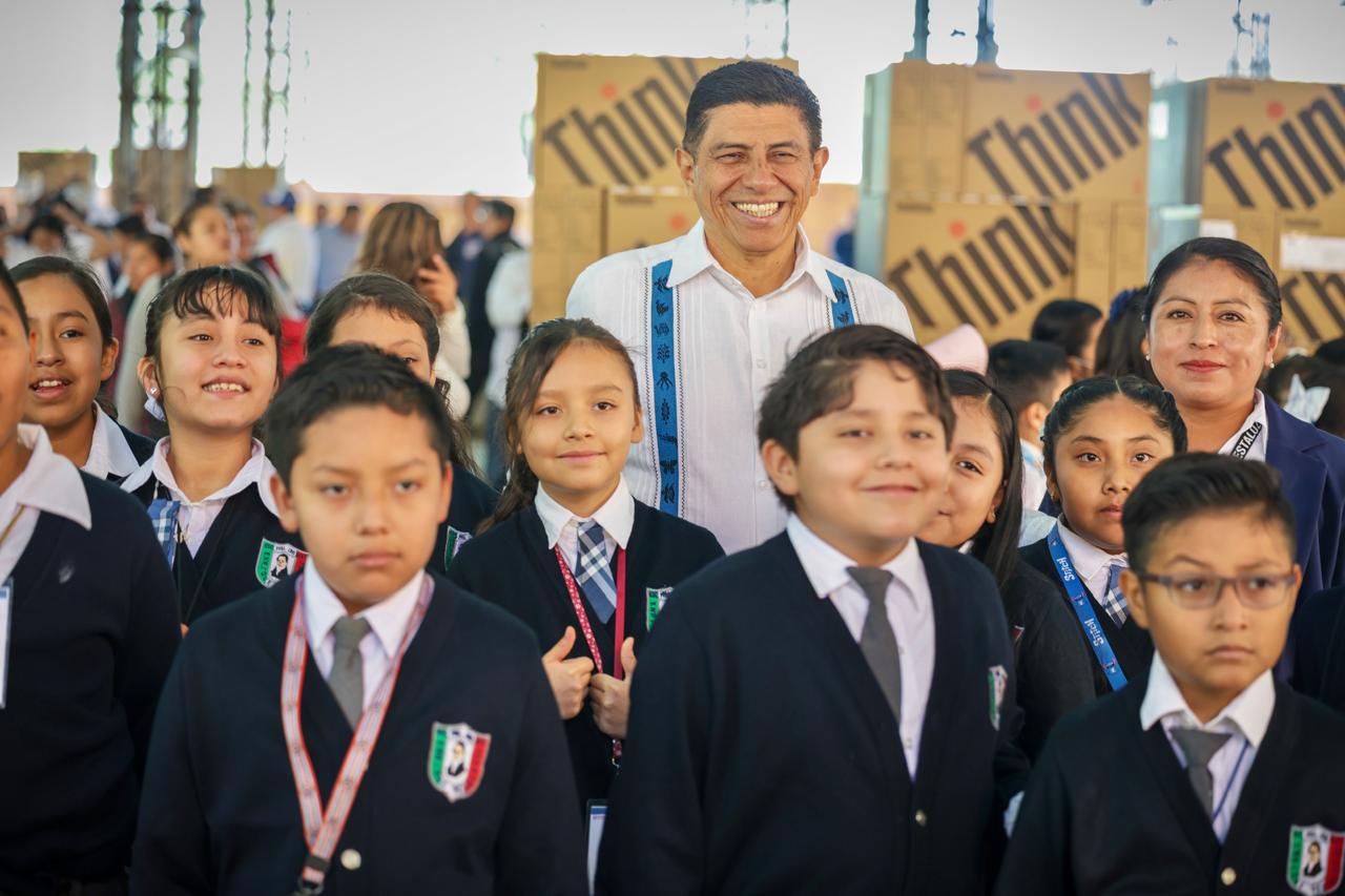 Santa Lucía del Camino, 04 de marzo de 2026.- Entre aplausos, porras y la alegría contagiosa de centenares de estudiantes, el gobernador Salomón Jara Cruz, acompañado del director general del Instituto Estatal de Educación Pública de Oaxaca (IEEPO), Emilio Montero Pérez, encabezó este miércoles la entrega de equipamiento tecnológico a 262 escuelas de educación básica de Valles Centrales, en cumplimiento del compromiso de la presidenta Claudia Sheinbaum con el magisterio oaxaqueño, y con el respaldo del Gobierno estatal.