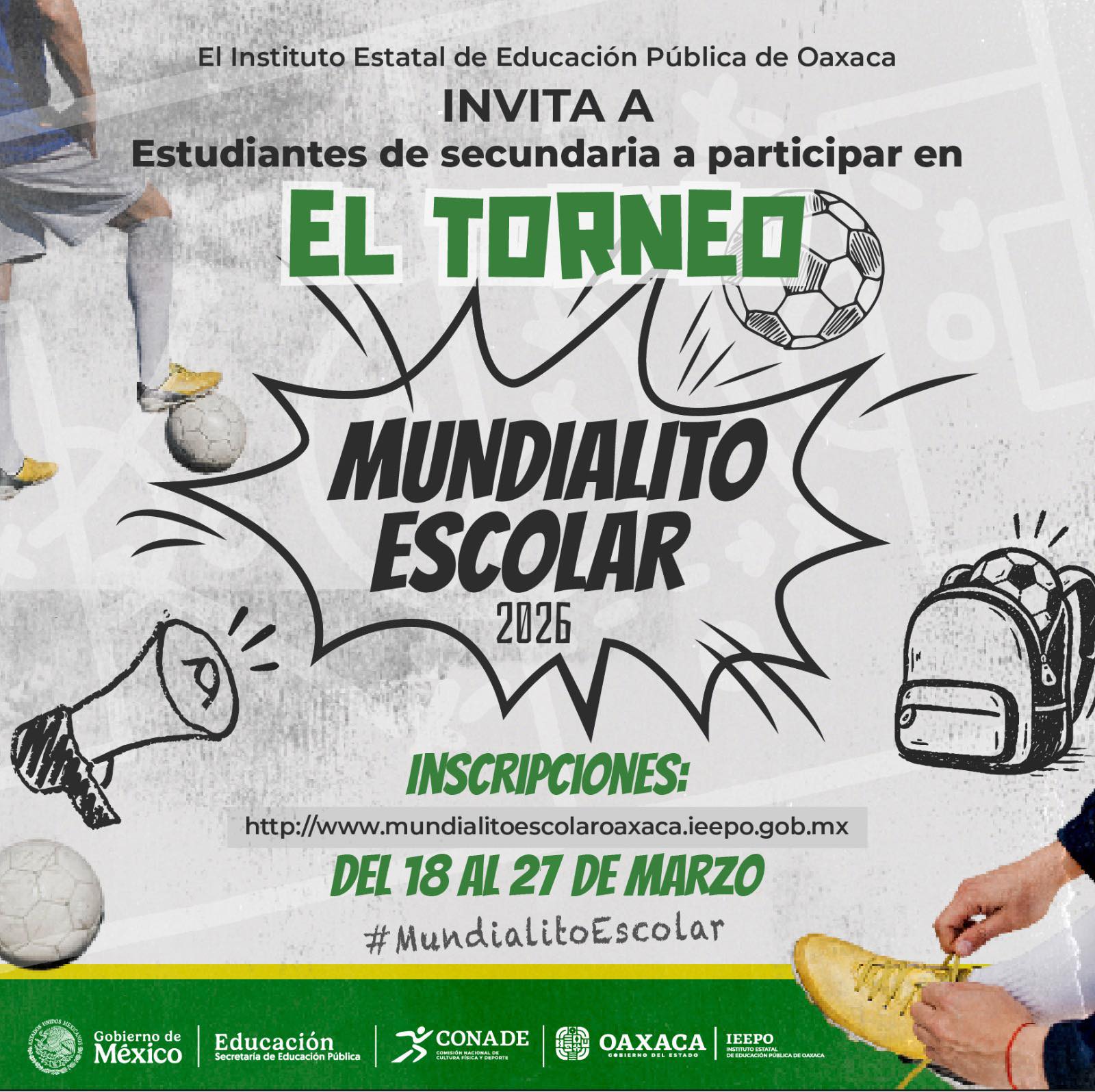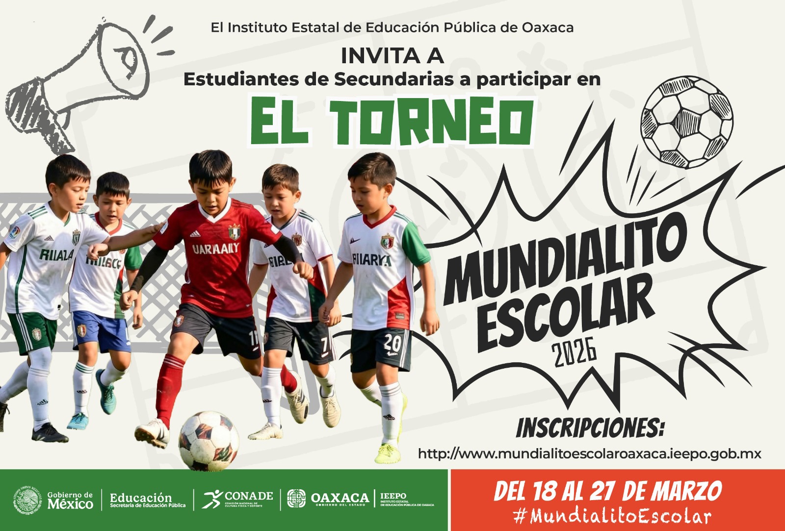 Oaxaca de Juárez, Oax., 20 de marzo de 2026.- Como una experiencia deportiva única que fomenta el compañerismo y la sana convivencia, el director general del Instituto Estatal de Educación Pública de Oaxaca (IEEPO), Emilio Montero Pérez, invita a las y los estudiantes de nivel Secundaria, de 13 a 15 años de edad, a participar en el torneo de fútbol “Mundialito Escolar 2026”, en sus fases regional y estatal.