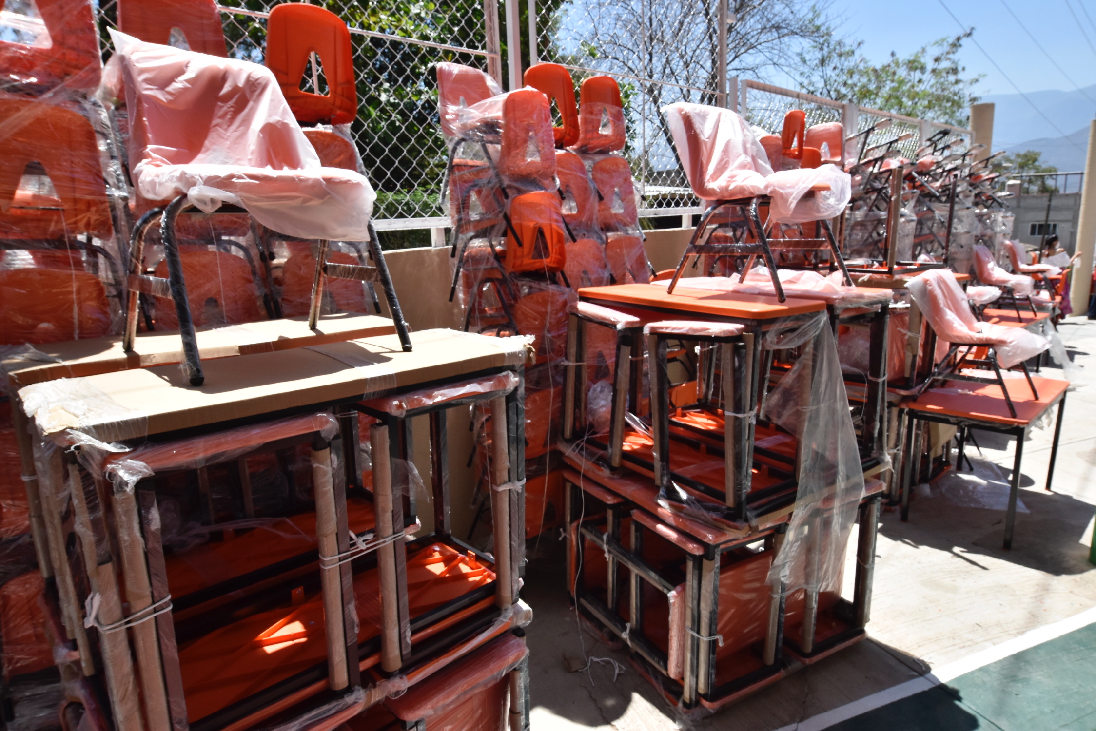 Tanto en la Cañada como en la Costa se distribuyeron mesas, sillas, pizarrones, equipos de sonido, computadoras, archiveros, impresoras,  escritorios, botes de pintura, instrumentos de banda de guerra y paquetes de material de aseo, deportivo y de oficina.