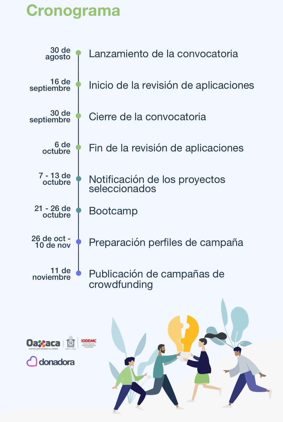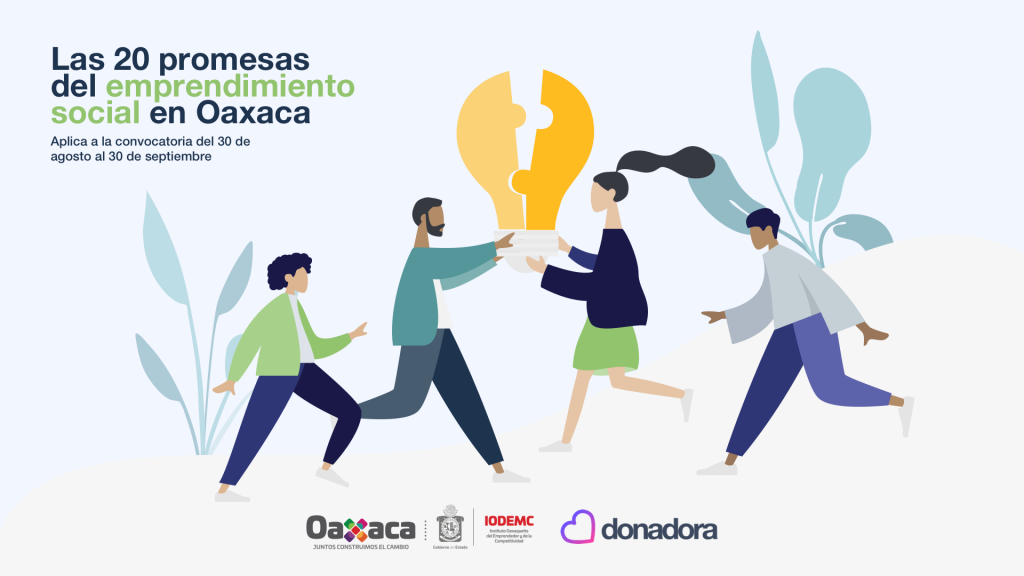 El IODEMC y Donadora convocan a proyectos de emprendimiento social cuyo fin sea la resolución de alguna problemática social local y la generación de impacto positivo en Oaxaca, a aplicar en un proceso de selección para asistir a un bootcamp de una semana con el objetivo principal de capacitar a los emprendedores seleccionados para hacer crecer sus proyectos mediante la creación de una estrategia de negocios y prepararlos para recaudar fondos a través del fondeo colectivo.