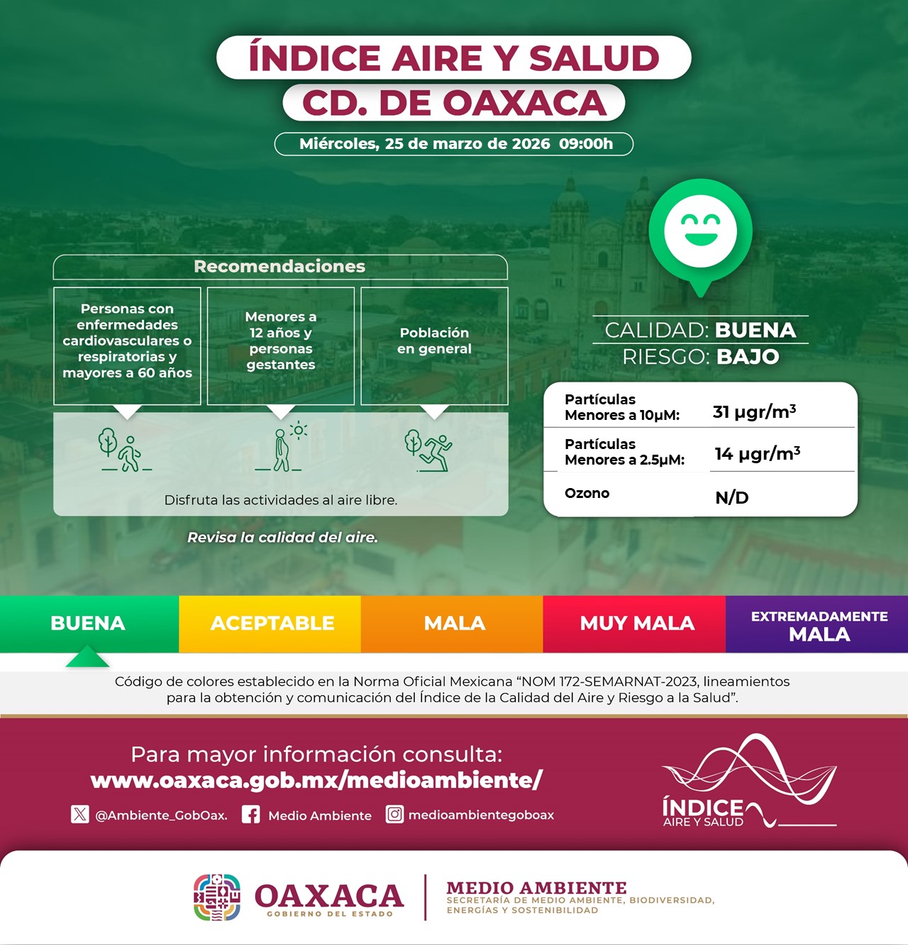 La publicación de la información se realiza acorde a la NOM-172-SEMARNAT-2019 que establece los lineamientos para la obtención y comunicación del Índice de Calidad del Aire y Riesgos a la Salud.