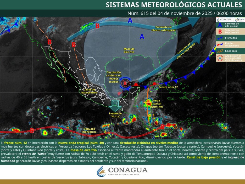 De acuerdo con el pronóstico del tiempo emitido por la Comisión Nacional del Agua (Conagua), estas condiciones son ocasionadas por la onda tropical número 40, que se desplazará gradualmente sobre el sur de México en combinación con un canal de baja presión.