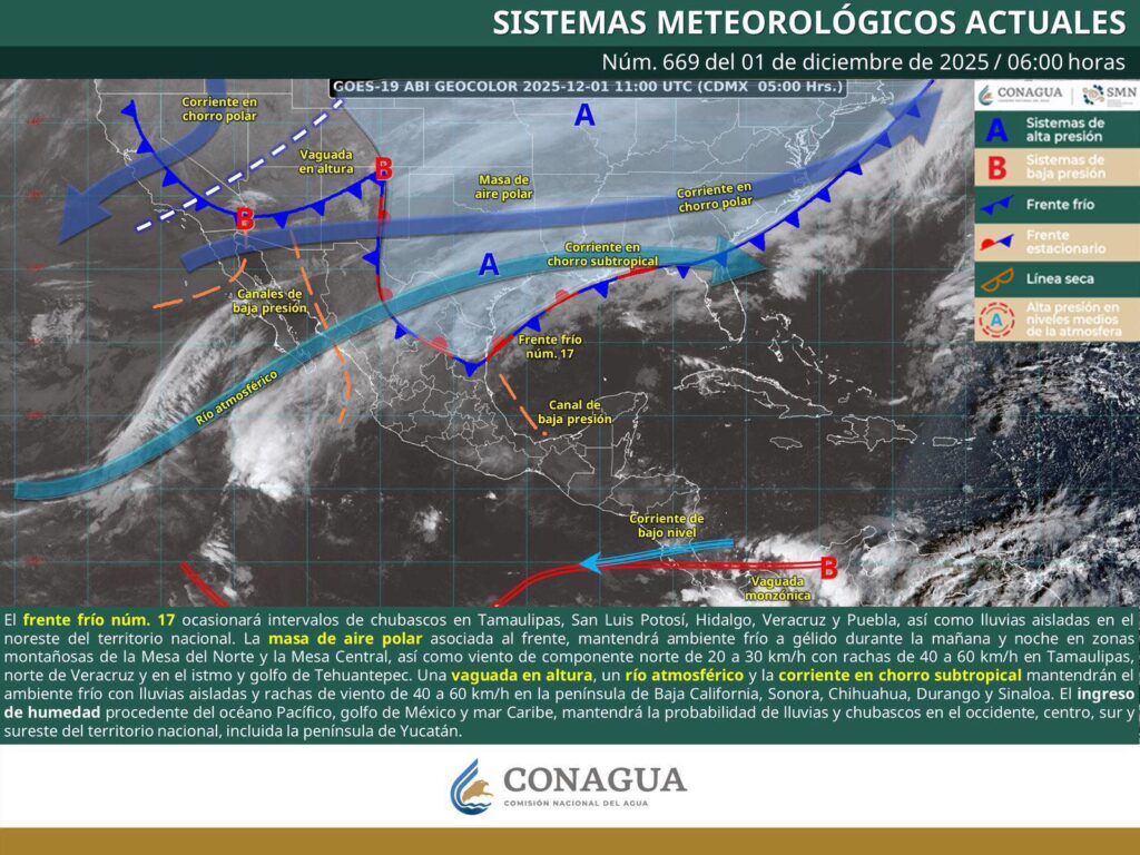 De acuerdo con el pronóstico del tiempo emitido por la Comisión Nacional del Agua (Conagua), la masa de aire polar que impulsa a este sistema ocasionará un evento de norte fuerte a muy fuerte en el oriente del Istmo de Tehuantepec, con rachas de viento de 70 a 90 kilómetros por hora, así como oleaje elevado en aguas del Golfo de Tehuantepec.