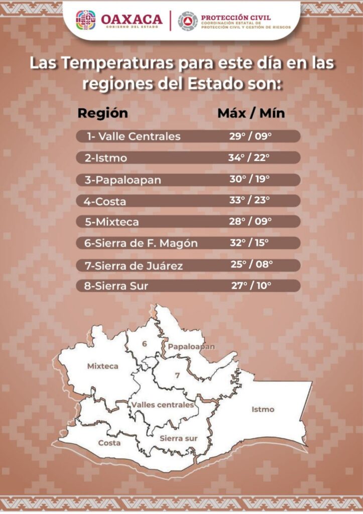 La Coordinación Estatal de Protección Civil y Gestión de Riesgos te da a conocer las temperaturas que predominarán en gran parte del día en las Ocho Regiones de Oaxaca.