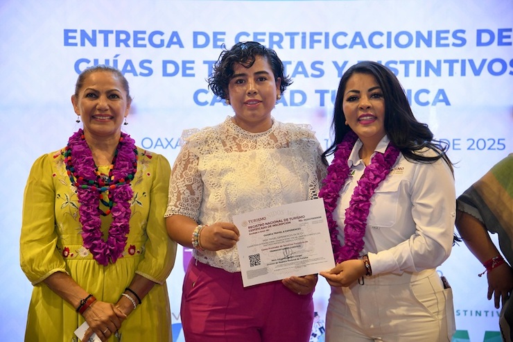 Oaxaca de Juárez, Oax. 17 de marzo de 2025.- La secretaria de Turismo, Saymi Pineda Velasco entregó 82 distintivos de calidad y certificaciones del Registro Nacional de Turismo a empresas, personas operadoras y guías turísticas; lo que permite garantizar la alta calidad de los servicios en Oaxaca para la atención a turistas nacionales e internacionales.