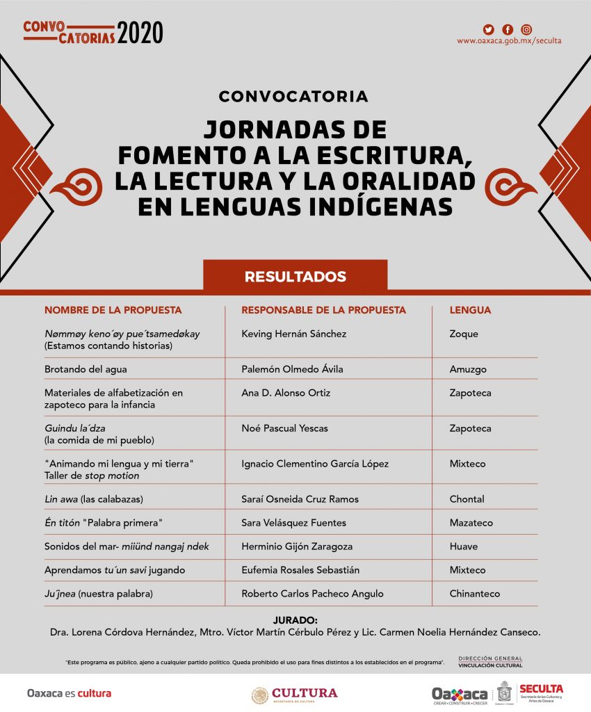 Resultados de Convocatoria Jornadas de Fomento a la escritura, la lectura y la oralidad en lenguas indígenas