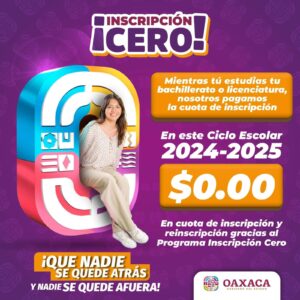 Porque en la #PrimaveraOaxaqueña nadie se queda atrás y nadie se queda afuera, eliminamos la cuota de inscripción o reinscripción con el programa #InscripciónCero. ¡Continúa tus estudios sin preocupaciones!