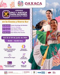 Oaxaca de Juárez, Oax., 20 de junio de 2024.- Del 25 al 29 de junio, el Secretariado Ejecutivo del Sistema Estatal de Seguridad Pública (SESESP) anunció la realización de las Jornadas de Paz y Justicia para Mujeres, Adolescentes y Niñas en las regiones de la Costa y Sierra Sur.