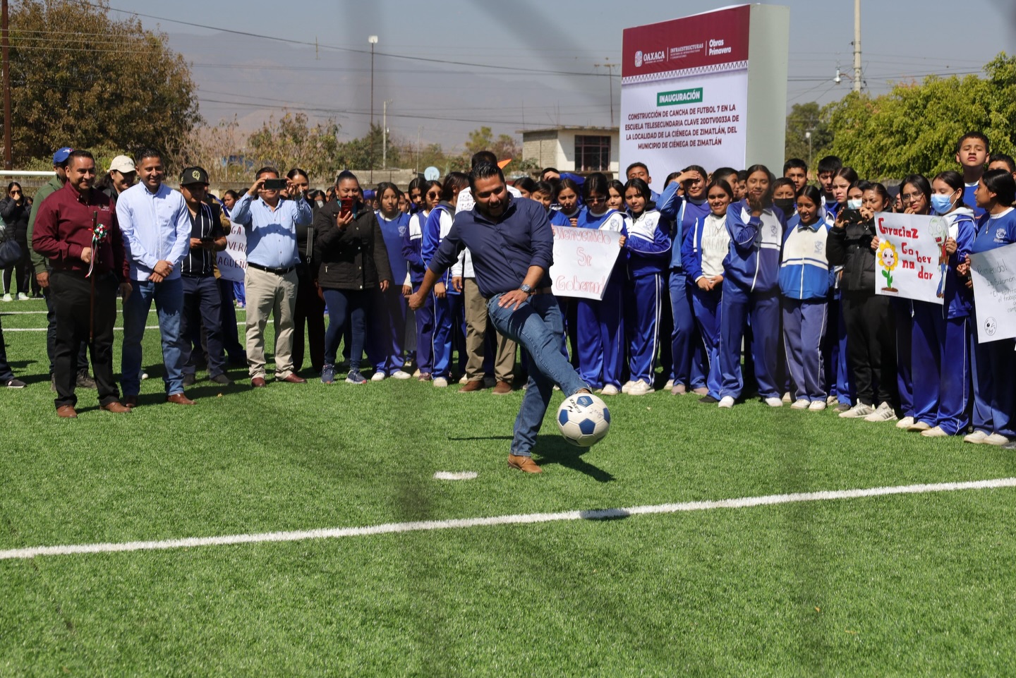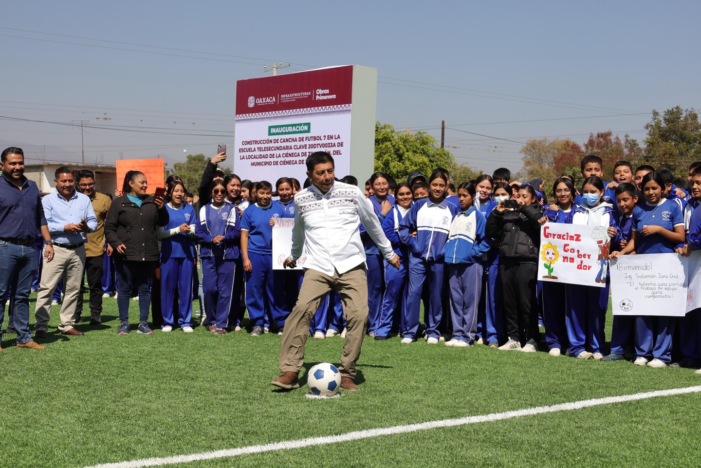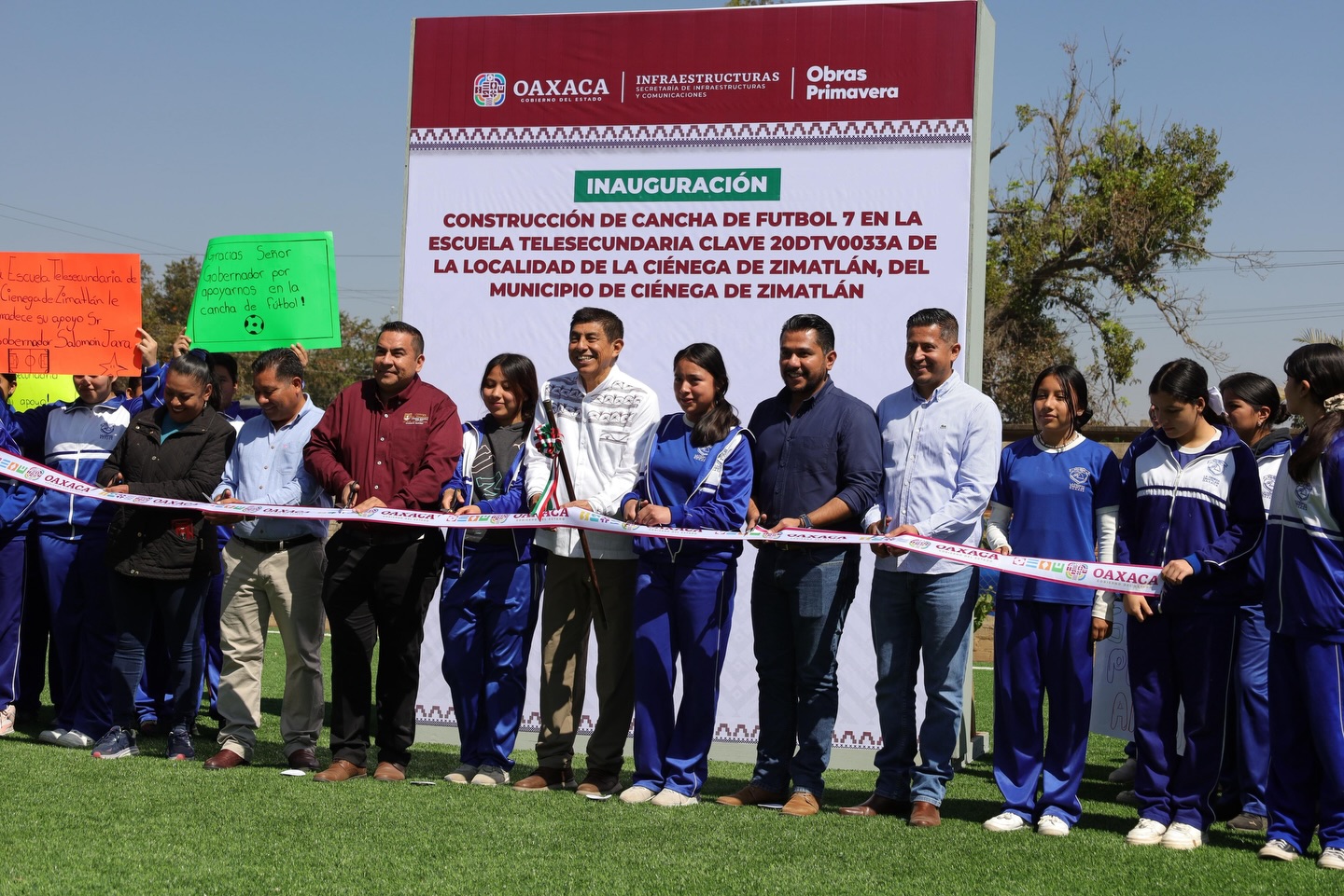 Bajo la visión del Gobernador Salomón Jara de fortalecer la infraestructura educativa y deportiva en el estado, inauguramos la Cancha de Futbol 7 en la Escuela Telesecundaria de La Ciénega de Zimatlán, municipio de Ciénega de Zimatlán, junto con el titular de la Secretaría de Infraestructuras y Comunicaciones, Arq. Carlos Vichido Hernández y autoridades municipales.