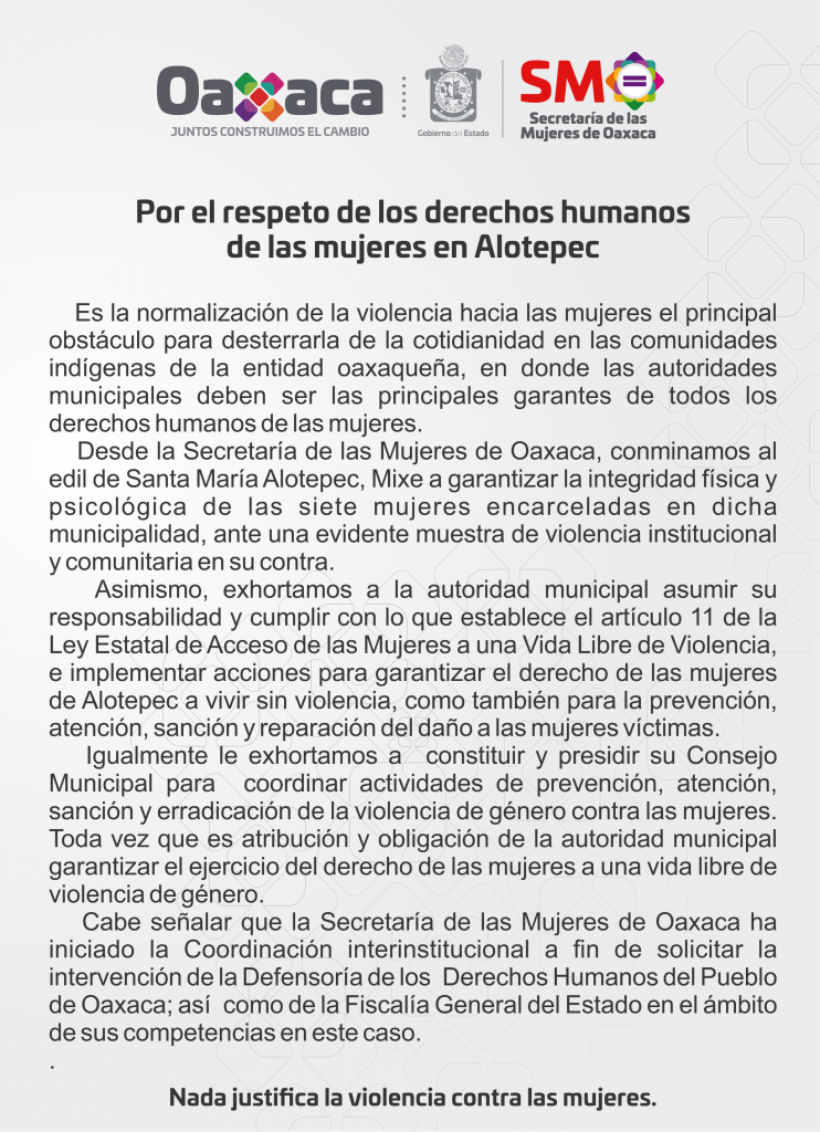 Desde la Secretaría de las Mujeres de Oaxaca, conminamos al edil de Santa María Alotepec, Mixe garantizar la integridad física y psicológica de las siete mujeres encarceladas en dicha municipalidad, ante una evidente muestra de violencia institucional y comunitaria.