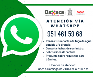 Oaxaca de Juárez, Oax. 21 de enero del 2021. En su compromiso de apoyar a las familias oaxaqueñas y acercar los servicios públicos durante la contingencia sanitaria, los Servicios de Agua Potable y Alcantarillado de Oaxaca (SAPAO), expide líneas de captura vía WhatsApp, informó la Directora General de esta dependencia.